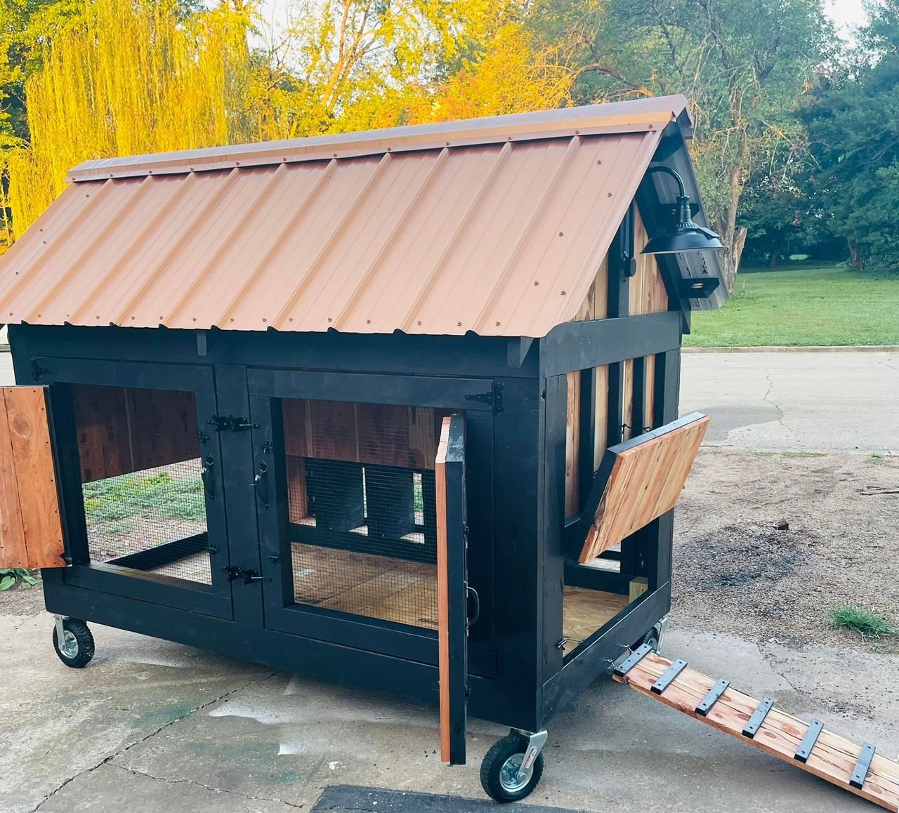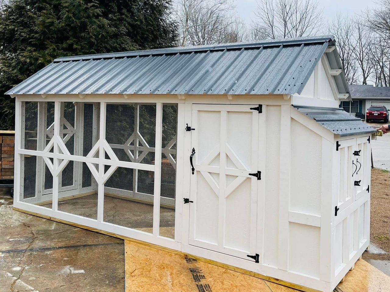 Our coops are handcrafted with well treated lumber using premium materials and expert craftsmanship. Every design is walk-in, fully predator-proof, water proof flooring, nesting boxes, roosting bars and features our signature deep litter system, so you can go a year or more without needing to clean it out. From classic styles to fully customized builds, we’re here to help you create a space that keeps your chickens happy, healthy, and safe and makes your life a whole lot easier.