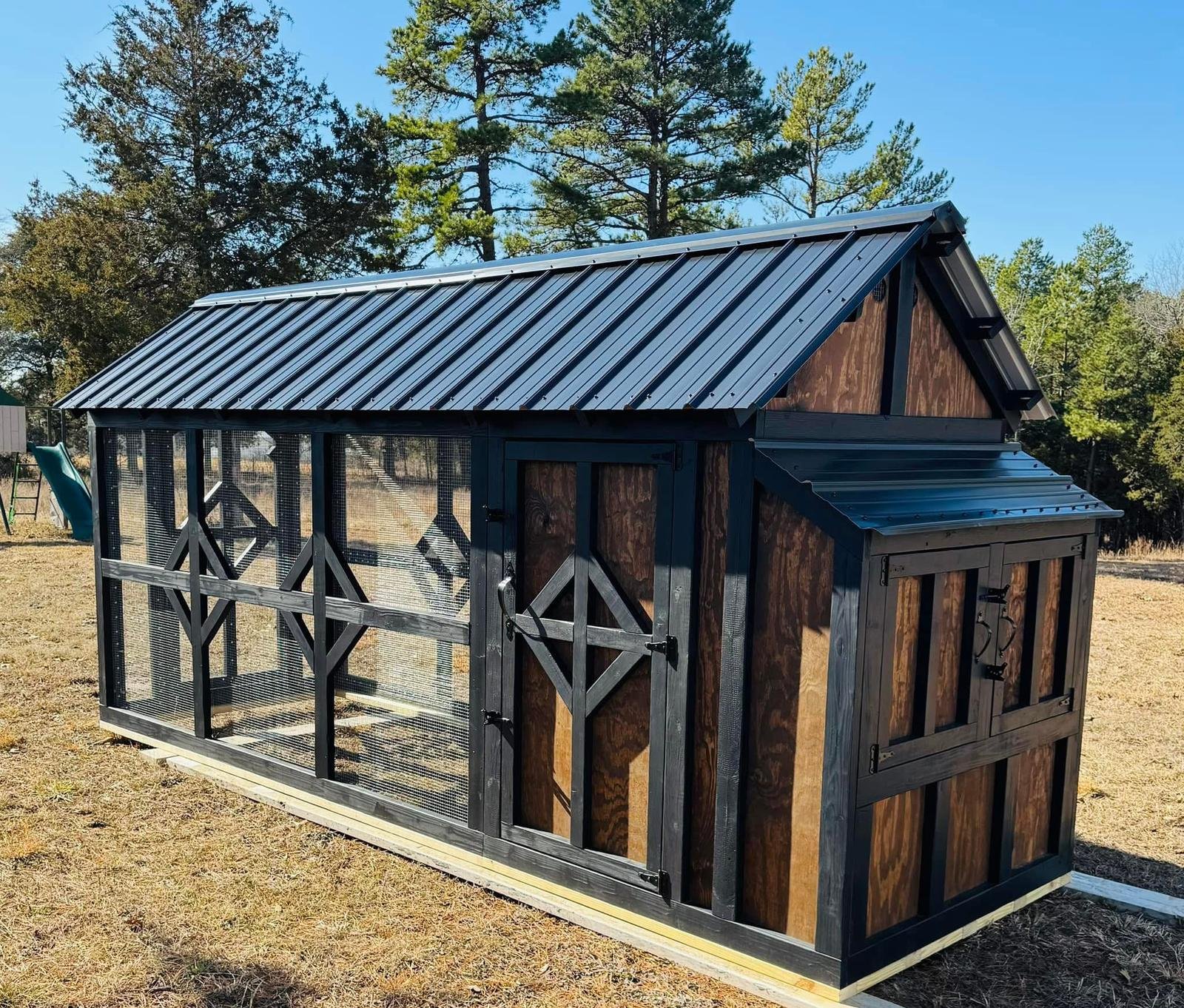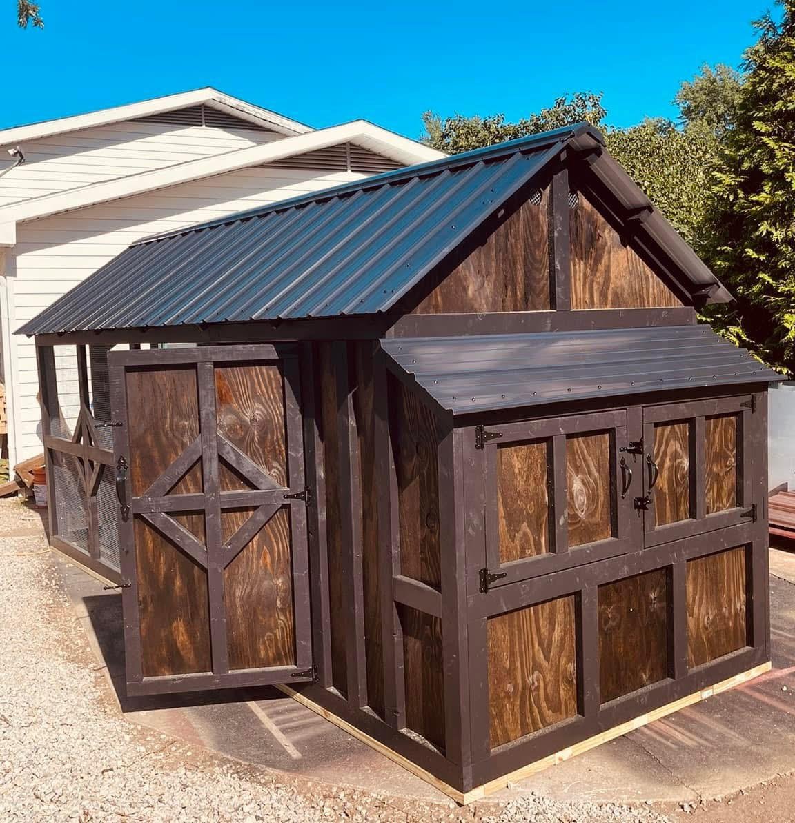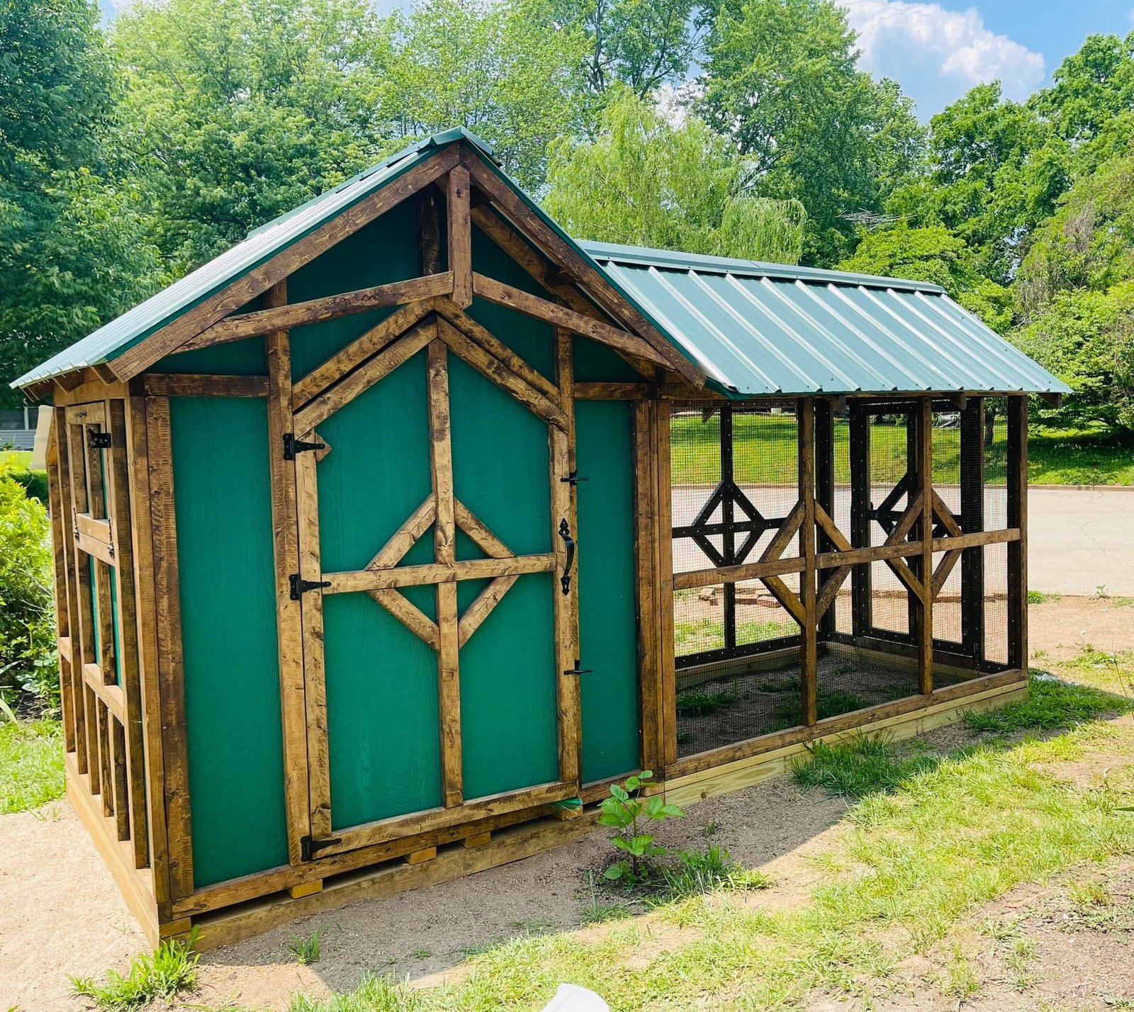 5×5 walk in coop w/black season flex exterior paint & stained panels. Includes two adult coop doors and roosting bars