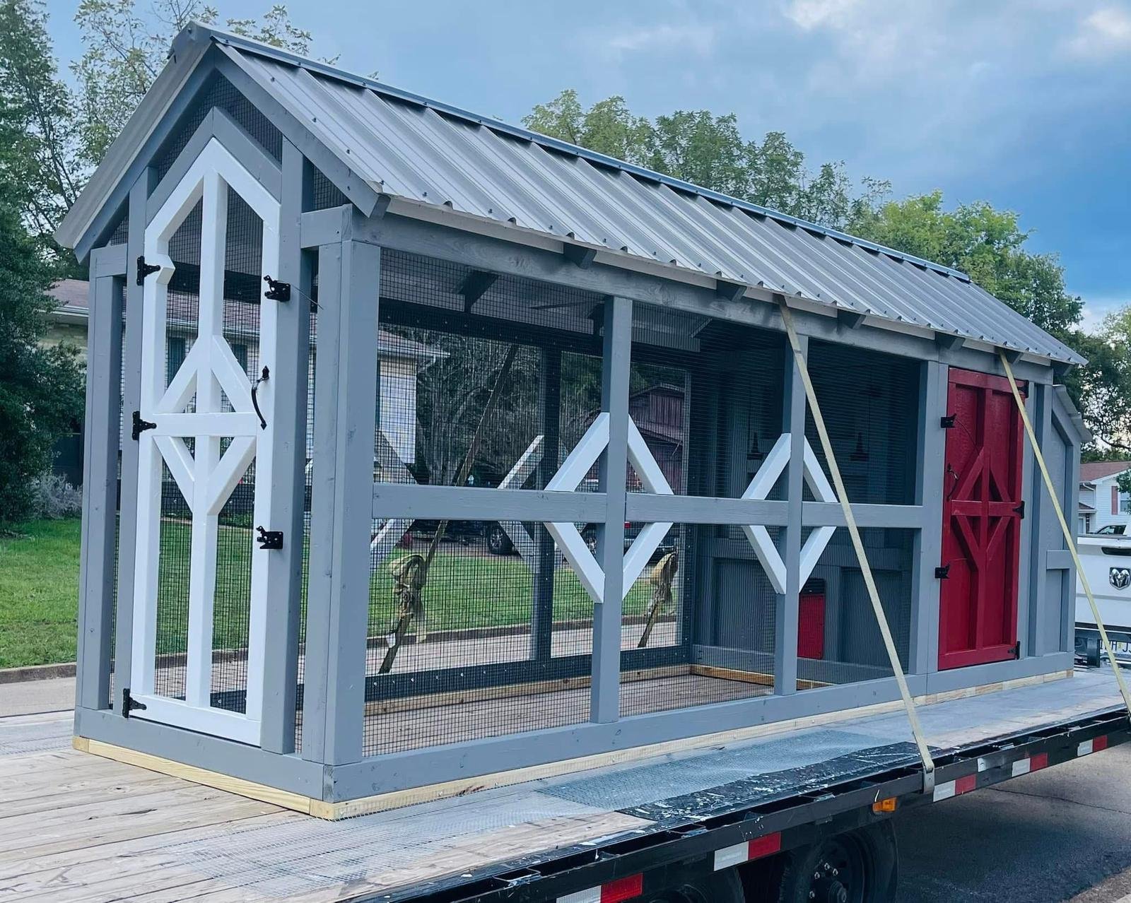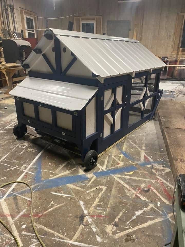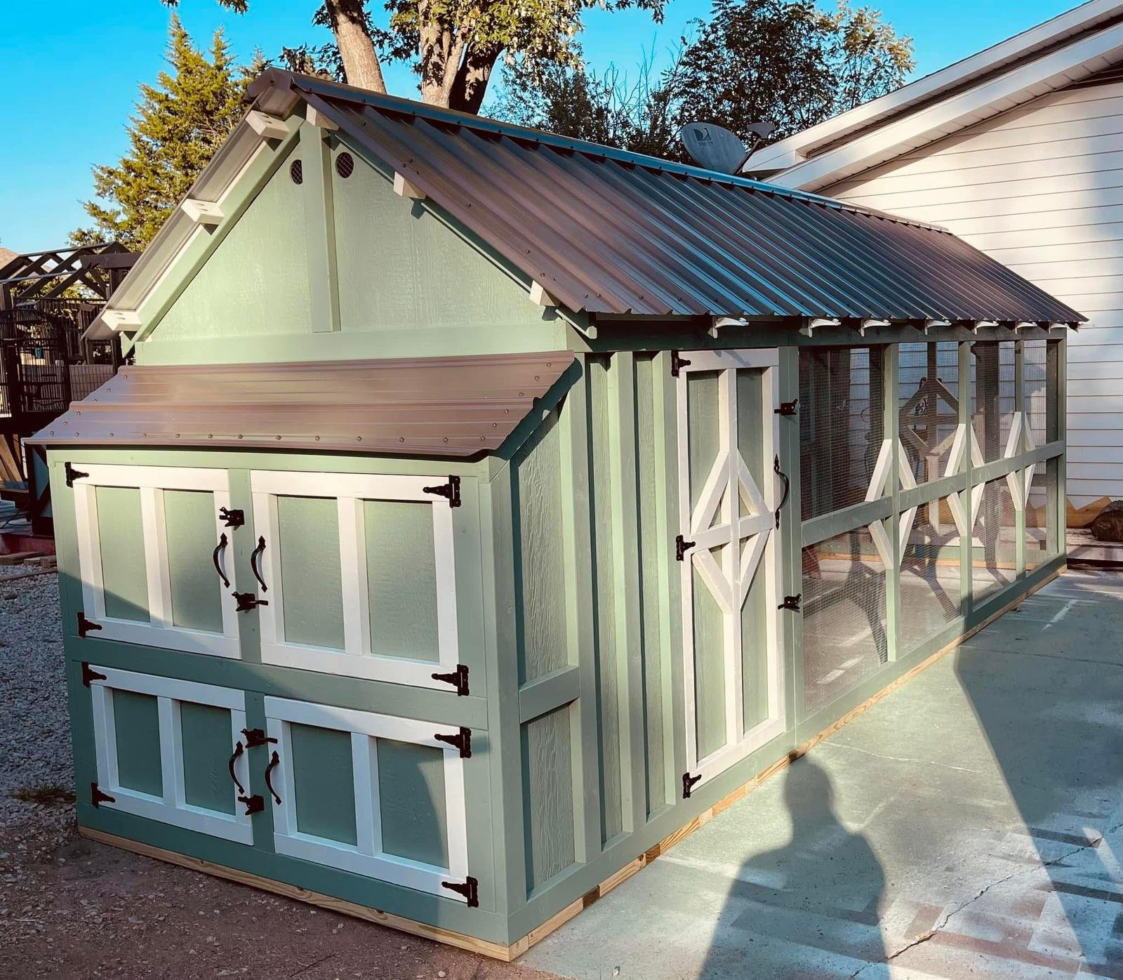 5×5 walk in coop w/black season flex exterior paint & stained panels. Includes two adult coop doors and roosting bars